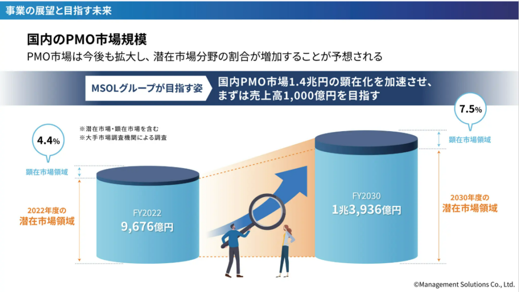 株式会社マネジメントソリューションズによると、2030年ごろには国内のPMO潜在市場規模は1.4兆円あるとのこと。